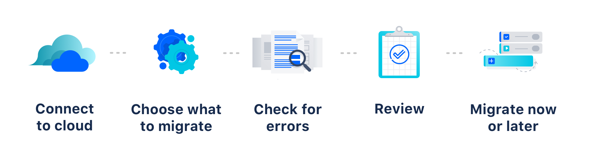 Once you have the app installed, there are five key steps to set up and run your migration from server or Data Center to cloud: