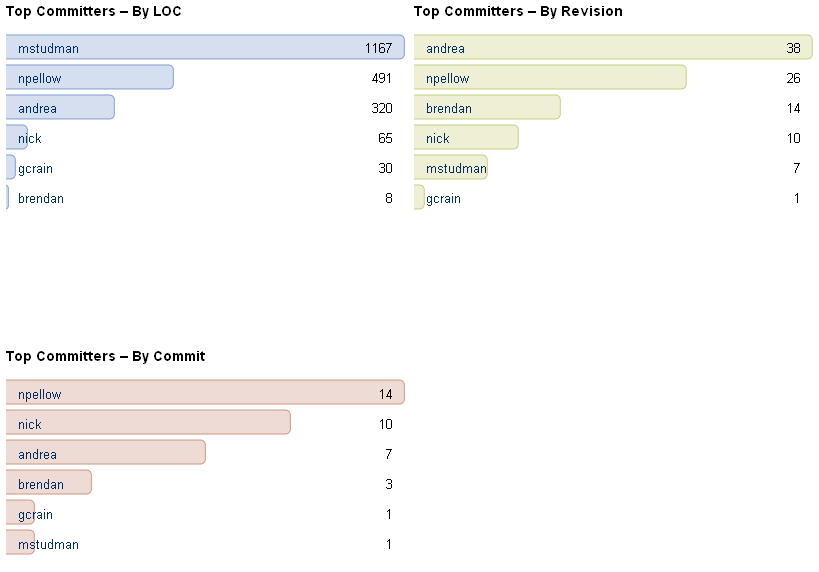 You can view per-author statistics for lines of code as a chart. This allows you to see how many lines of code were contributed to your project by each author, over time. You can easily view this information on the charts page. Note, if you are upgrading from a previous version of Fisheye, you will need to re-index the repository in order to show the per-author information.