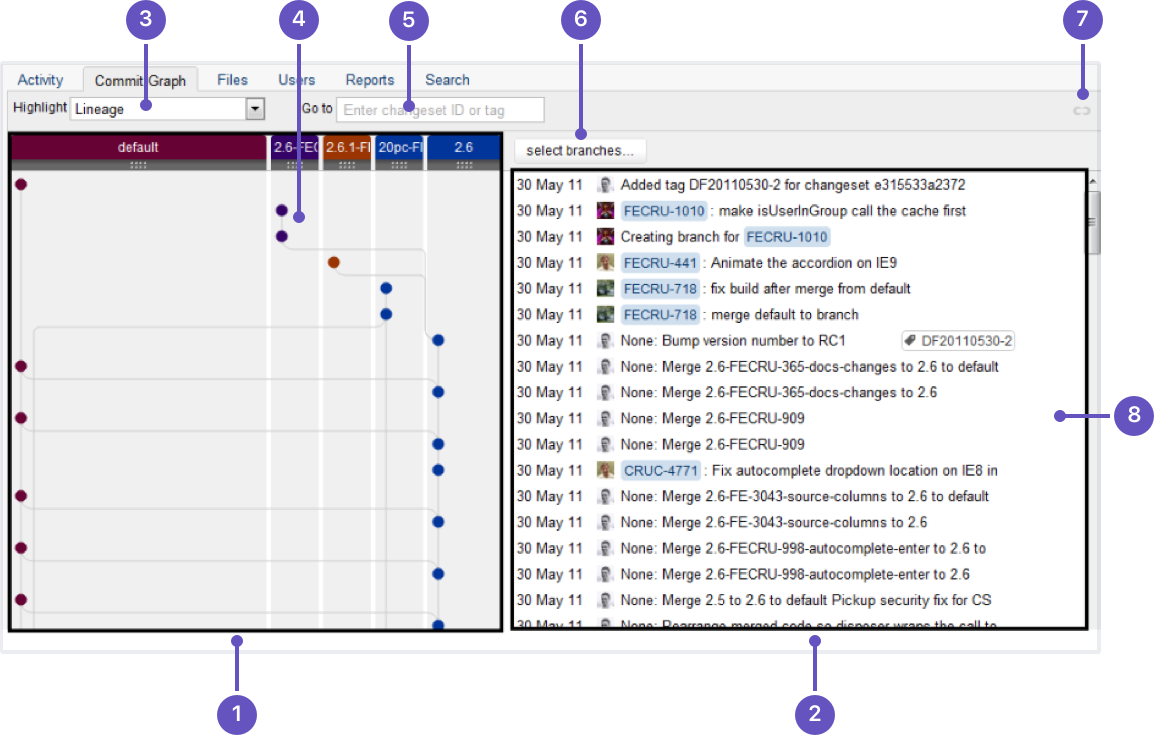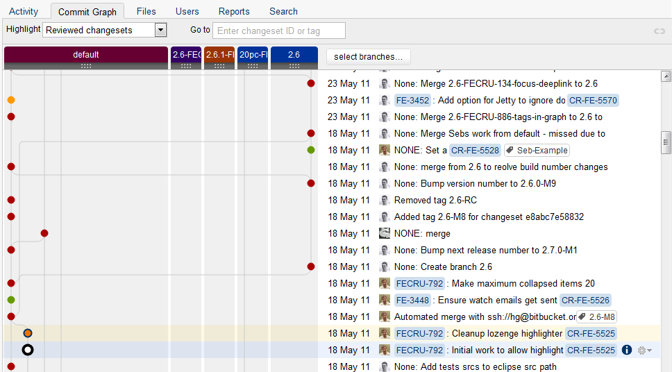 For example, if the 'master' swimlane is to the left of another swimlane, e.g. 'fisheye-2.6' branch, there will be no changesets shown in the 'fisheye-2.6' swimlane, as all the commits will be picked up in the 'master' swimlane. However, if you move the 'fisheye-2.6' swimlane to the left of the 'master' swimlane, it will pick up all of the Fisheye 2.6 commits.