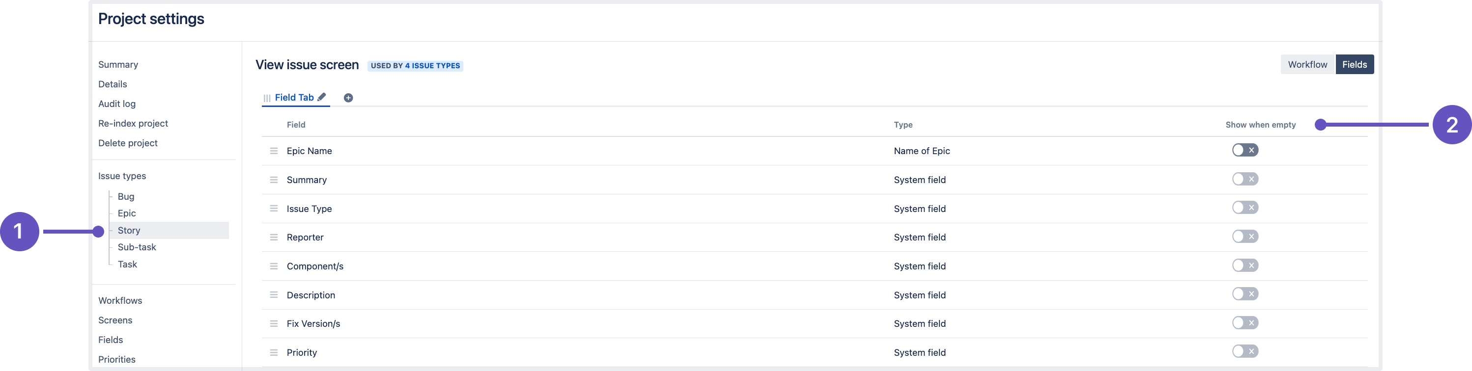- Show when empty toggle. When enabled, empty custom fields will be visible in the issue view.