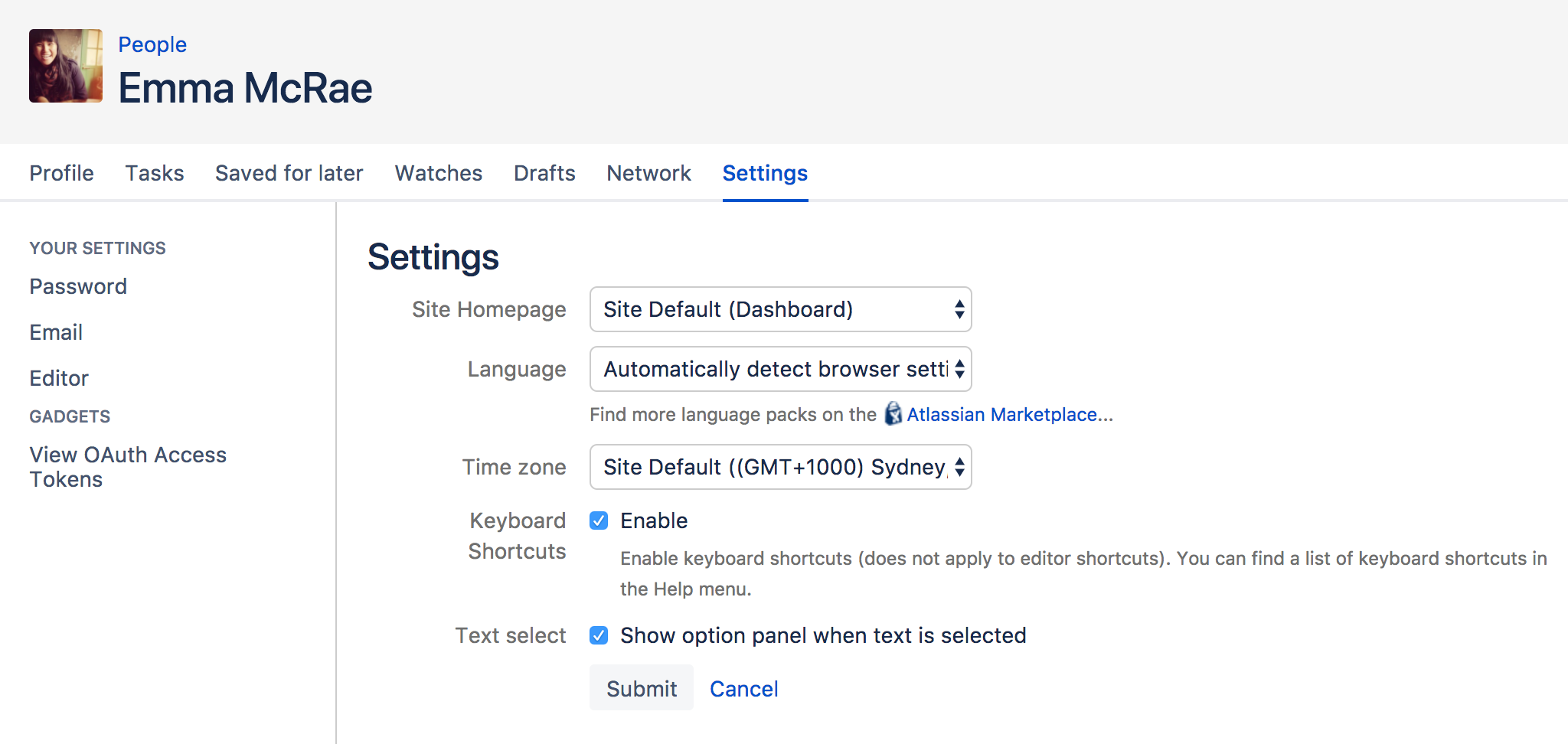 Alternatively, if your Confluence administrator has set a space home page as the landing page for the whole site, you can choose Dashboard from the Site Homepage drop down to use the dashboard as your landing page.