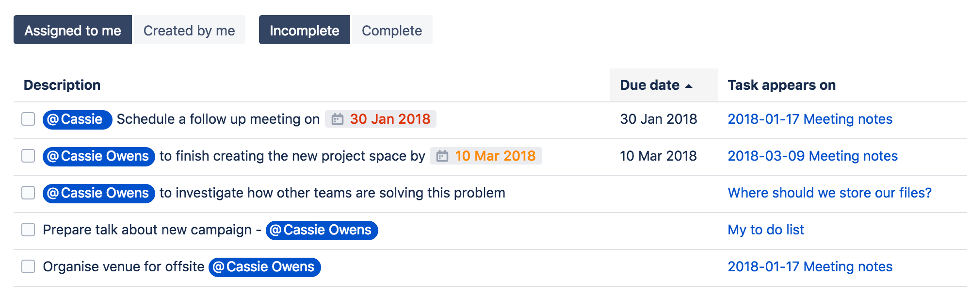 • If you assign a task to someone who doesn't have permission to view the page or space, they won't see the task.